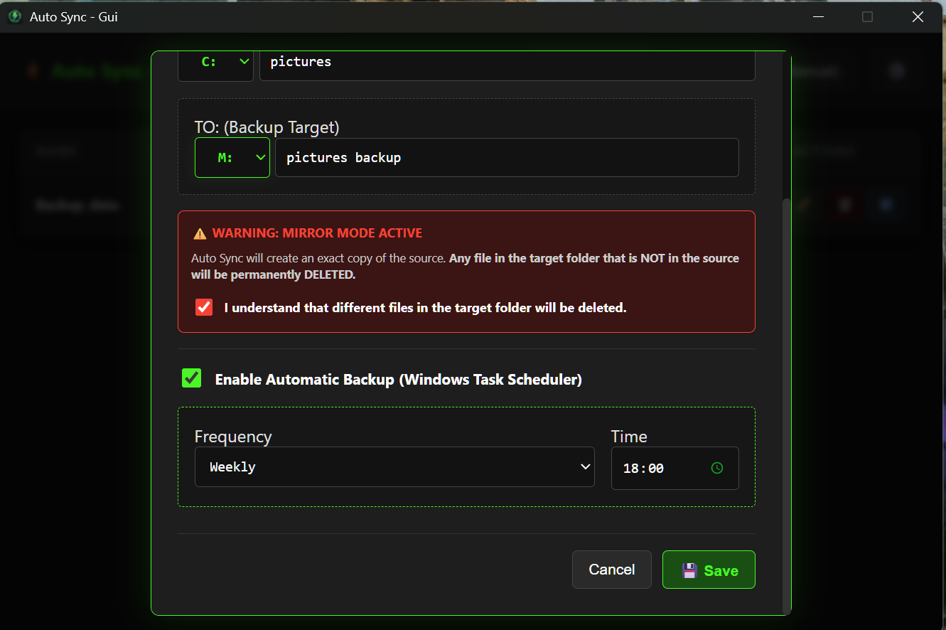 - 🛡️ Built-in Safety Lock: Features a Mirror Mode safeguard. The app forces you to acknowledge sync rules, preventing accidental file deletion on your target drives.